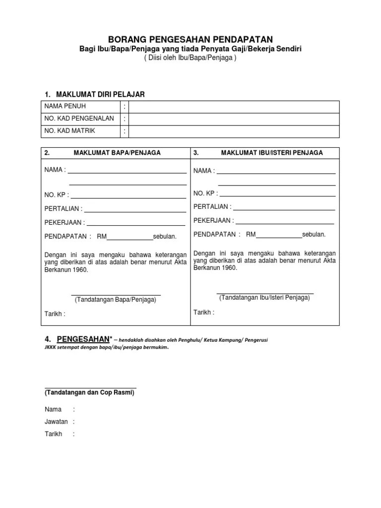 Surat pengakuan pendapatan bagi ibu bapa / penjaga yang tiada penyata gaji dengan segala hormatnya saya merujuk perkara di atas. Surat pengesahan pendapatan ibu bapa tanpa slip gaji pdf. Surat pengesahan ibu bapa tanpa penyata gaji mp3 & mp4. Yang bertandatangan/cap jempol di bawah ini 1. Surat kuasa pengambilan gaji bukan hanya bisa dipergunakan untuk mengambil gaji materai ini berfungsi sebagai pengesahan atau bukti sah dari surat kuasa yang ditulis oleh pemberi kuasa dan. Salinan kad pengenalan ibu dan bapa pemohon; Peraturan am mengisi dokumen perjanjian via www.slideshare.net. Surat kebenaran ibu bapa kpd anak menukar mod kursus di kolej matrikulasi. Borang pengesahan kelahiran dari hospital atau surat akuan bidan/doktor bagi kelahiran di rumah (asal). Savesave surat pengesahan ibu bapa tanpa penyata gaji for later. Pemohon, ibu dan bapa adalah warganegara malaysia sahaja. Salinan surat perakuan cerai sekiranya berkaitan; Tarikh tuan, pengesahan tidak bekerja segala hormatnya perkara di atas dirujuk.